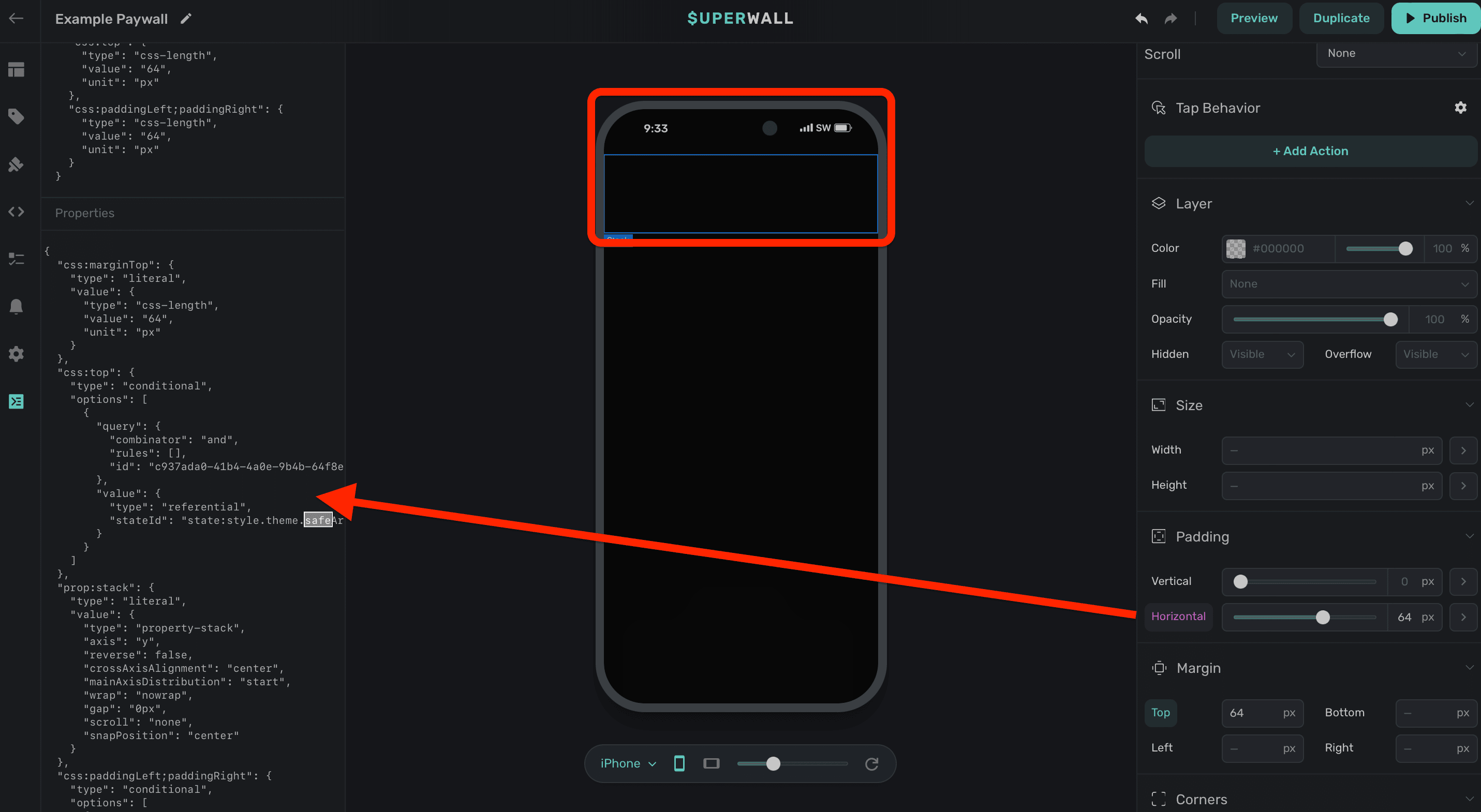 The debugger shows a raw representation of selected components. This is useful if you're trying to debug layouts or designs, since the CSS Superwall is generating will show here. It also will show what variables are applied and what they're specifically being evaluated to.